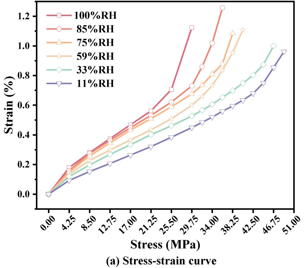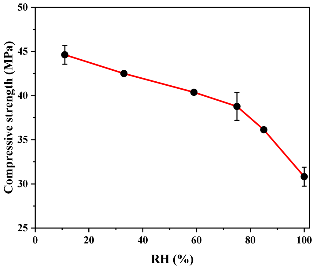 圖4為不同環境濕度平衡情況下HCP的抗壓強度。抗壓強度隨著RH增加而降低。