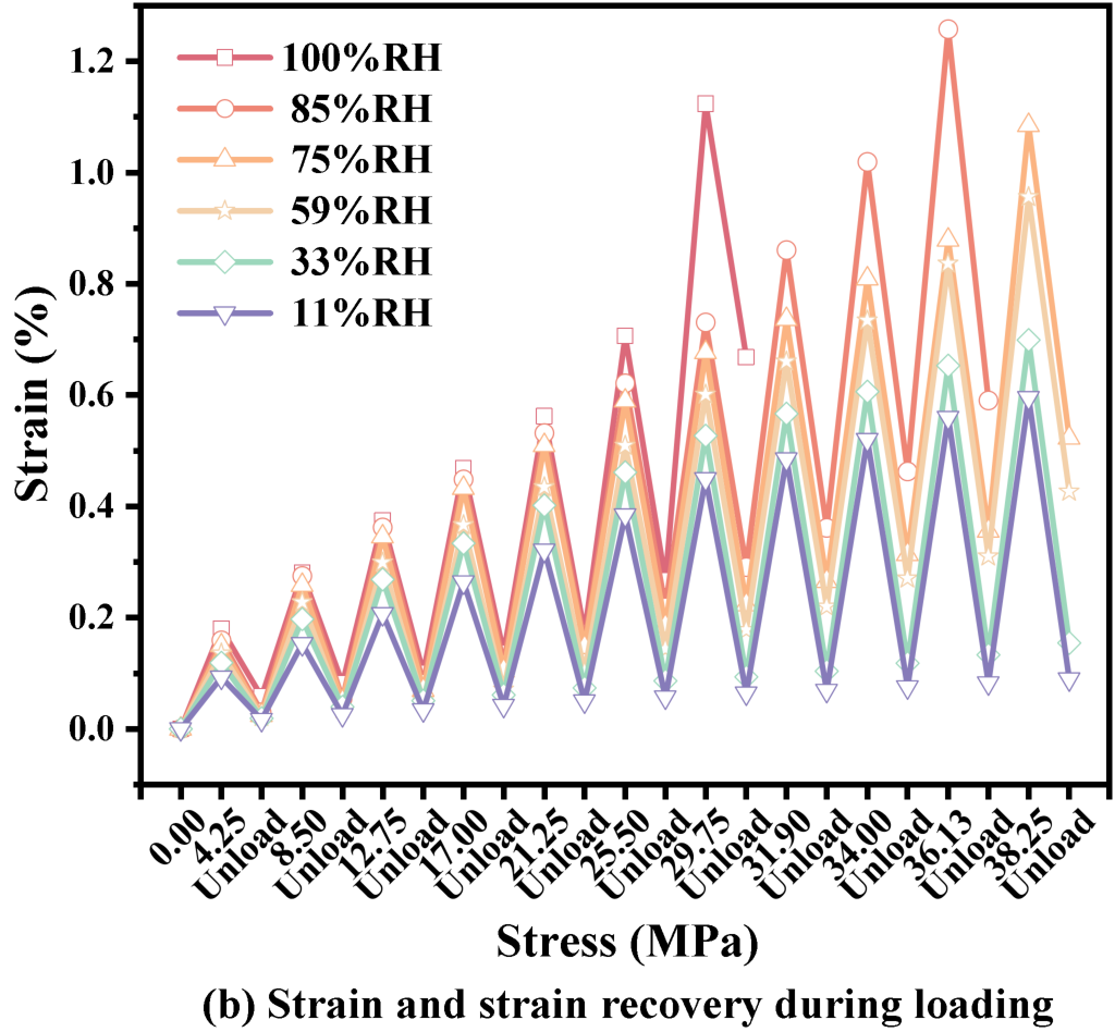 當荷載值<臨界荷載(75%fc)前,HCP的應變隨著荷載值增大線性增加。當荷載值超過臨界荷載后,HCP的應變增加率隨著應力值增加逐漸增加。施加相同應力值時,HCP徐變變形隨著RH增加而增加。當荷載值為25.5 MPa時,100% RH和75% RH試樣的應變分別達到0.71%和0.59 %,而11% RH試樣的應變僅為0.38%。由于C-S-H的凝膠特性,失水會導致C-S-H層間距的減小,C-S-H層間距減小及凝膠水的失去導致C-S-H層滑移變得困難,C-S-H徐變柔度降低。卸載狀態下100% RH,75% RH,11% RH試樣的應變恢復量分別為0.44%,0.41%,0.32%。這說明隨著C-S-H含水量的增加,HCP的徐變恢復更為顯著。