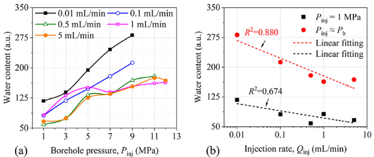 隨井筒壓力P上升,水含量線性增長,但不同Qinj下斜率差異顯著: