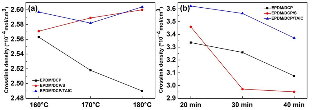 溫度、時(shí)間和硫化劑類(lèi)型對(duì)EPDM橡膠交聯(lián)密度的影響如圖2所示。如圖2a所示,隨著溫度的逐漸升高,EPDM/DCP橡膠的交聯(lián)密度逐漸降低,而EPDM/DCP/S和EPDM/DCP/TAIC的交聯(lián)密度保持在相對(duì)合理的數(shù)值。一種可能的解釋可能是,如S和TAIC等固化輔助劑的存在可以將C-S或C-O鍵引入該交聯(lián)體系,以提高交聯(lián)結(jié)構(gòu)的完整性。此外,在EPDM橡膠中,在長(zhǎng)時(shí)間高溫條件下,C-S、C-C和C-O鍵斷裂,導(dǎo)致EPDM橡膠的交聯(lián)密度降低。因此,EPDM橡膠的最佳固化溫度為160℃。隨著時(shí)間的增加,EPDM橡膠的交聯(lián)密度呈持續(xù)下降趨勢(shì),其中EPDM/DCP/S的交聯(lián)密度下降最快(圖2b)。C-S、C-C和C-O鍵的鍵能分別為276kJ/mol、334 kJ/mol和364 kJ/mol,其中C-S鍵的鍵能最低。在長(zhǎng)時(shí)間的高溫條件下,C-S鍵比其他鍵更容易被破壞。EPDM橡膠的最佳固化時(shí)間為20 min。當(dāng)溫度為160℃時(shí),時(shí)間為20 min時(shí),EPDM橡膠的交聯(lián)密度分別達(dá)到3.336,3.459和3.622×10^-4 mol/cm^3。EPDM/DCP/S和EPDM/DCP/TAIC的交聯(lián)密度均顯著高于EPDM/DCP,說(shuō)明S和TAIC的摻入有利于提高橡膠的交聯(lián)密度。