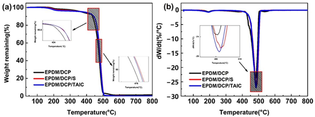 熱重(TG)和差分熱重(DTG)曲線EPDM橡膠的熱解反應(yīng)如圖9a,b所示。與EPDM/DCP、Ti、EPDM/DCP/S和EPDM/DCP/TAIC的Tp和Tr均顯著升高,但其含量顯著升高,EPDM/DCP/S和EPDM/DCP/TAIC的炭化產(chǎn)率略有下降。這個(gè)EPDM/DCP/S和EPDM/DCP/TAIC比EPDM/DCP具有更高的熱穩(wěn)定性 。這要?dú)w因于S和TAIC的合并能提高EPDM橡膠的交聯(lián)度,從而提高熱性能,EPDM橡膠的穩(wěn)定性。