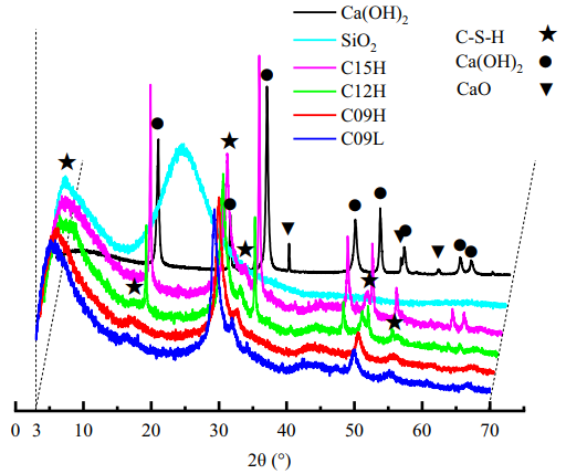 通過CH和非晶態SiO2粉末在室溫下的反應,制備了三種不同的C-S-H樣品,理論Ca/Si比為0.9、1.2、1.5。水與固體的比率(W/S比率)被固定為0.8。