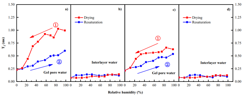 基本上,從圖6中可以看出。層間水的T2值在D-R循環期間沒有表現出明顯的變化,而凝膠孔隙水的T2值在干燥期間逐漸減少,在隨后的再飽和過程中增加,這可以用一個簡單的水去除-補充過程來解釋。有趣的是,在給定的RH(RH>11%)下,重飽和度曲線中的凝膠孔隙水的T2值低于干燥曲線中的T2值,這表明當C-S-H經歷了嚴重的干燥處理(RH為0%)時,與初始飽和C-S-H中的凝膠孔隙水相比,水分子在C-S-H凝膠孔隙中的約束更高。凝膠孔的尺寸減少和吸收減少都可能導致更多的凝膠孔隙水的限制,從而降低了T2值。