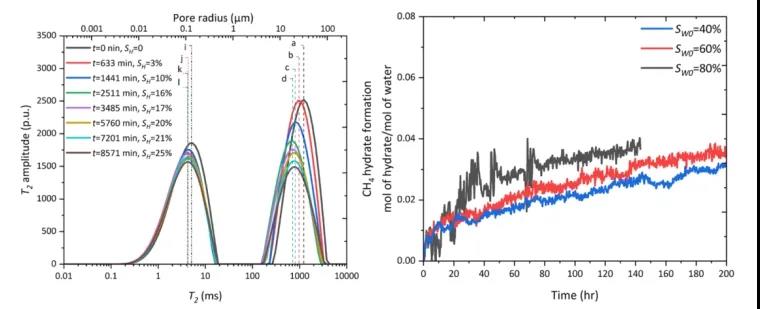 1、MH生成導(dǎo)致孔隙被固體MH填充,殘余水遷移到相對較大的孔隙和孔隙大小分布較窄的孔隙中心。從T2譜的右移可以看出,在泥砂中生成MH的過程中,孔隙中自由水的比表面積(表面積與體積之比)持續(xù)下降。