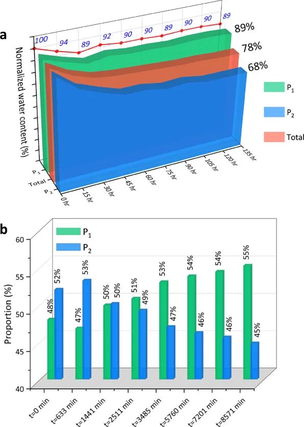 2研究結(jié)果表明,黏土在水合物生成初期(約前30小時(shí))促進(jìn)水合物生成,但黏土束縛水(P1)總體轉(zhuǎn)化率較低,只有10%左右。而砂質(zhì)孔隙中的自由水(P2)持續(xù)被消耗,最終轉(zhuǎn)化率達(dá)到32%(見圖六a)。圖六(b)則證實(shí)了黏土束縛水(P1)率先被消耗,即表明黏土在生成初期促進(jìn)水合物生長。