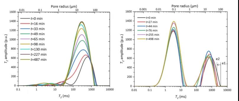 作者首先利用高壓壓汞與核磁共振技術(shù)聯(lián)用進(jìn)行孔隙尺寸標(biāo)定,成功定量出T2譜與孔隙尺寸分布(PSD)間的關(guān)系,獲得實(shí)時(shí)孔隙演化特性。