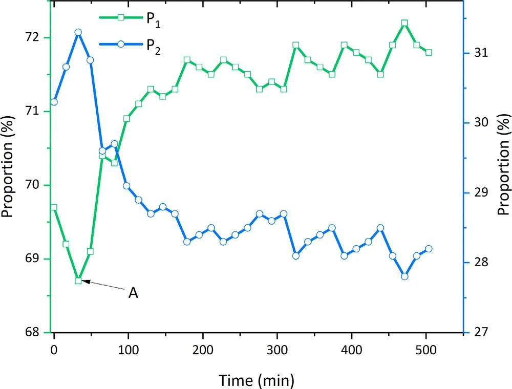 圖八顯示,甲烷水合物首先在砂質(zhì)大孔隙中分解,造成P2信號值的快速增大;隨后在黏土小孔隙中分解,在tA=33分鐘以后,砂質(zhì)大孔隙中的產(chǎn)出水逐漸向黏土束縛水轉(zhuǎn)化,伴隨著自由水(P2)信號值的降低以及黏土束縛水(P1)信號值的增大。