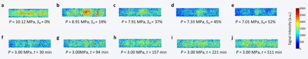 圖九提供了在T=2℃的石英砂中MH生成和分解過程的MRI圖像(采用HSE序列)的演變。成像信息與整個(gè)樣品有關(guān),沒有被切片。圖a到e代表MH的生成,圖f到j(luò)代表MH的分解。
