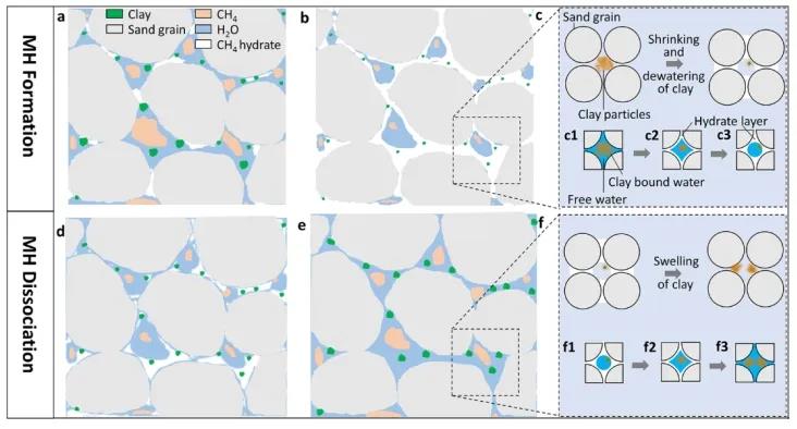 基于上述分析,圖十繪制了泥質(zhì)粉砂介質(zhì)內(nèi)甲烷水合物的生成和分解機(jī)制。在水合物生成過程中,分布在砂質(zhì)大孔隙內(nèi)部的黏土影響水合物的生長動(dòng)力學(xué),并逐漸失水收縮進(jìn)而改變孔隙結(jié)構(gòu)(S/V減小);而在水合物分解過程中,黏土的吸水性質(zhì)導(dǎo)致分解產(chǎn)生的自由水向黏土束縛水轉(zhuǎn)化,黏土的膨脹再次改變孔隙結(jié)構(gòu)(S/V增大)。