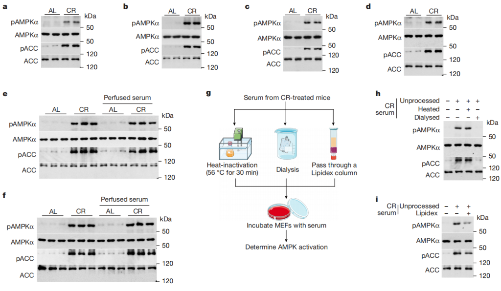 1.3圖1g – 1i:對(duì) CR 血清進(jìn)行不同處理后發(fā)現(xiàn),熱處理后的 CR 血清仍能激活 AMPK,而透析后的 CR 血清失去該能力,且通過(guò) Lipidex 柱處理后,洗脫部分雖仍可激活 AMPK 但能力降低,說(shuō)明 CR 血清中熱穩(wěn)定、低分子量的極性代謝物介導(dǎo)了 AMPK 的激活,且非極性化合物和脂質(zhì)可能不參與此過(guò)程。