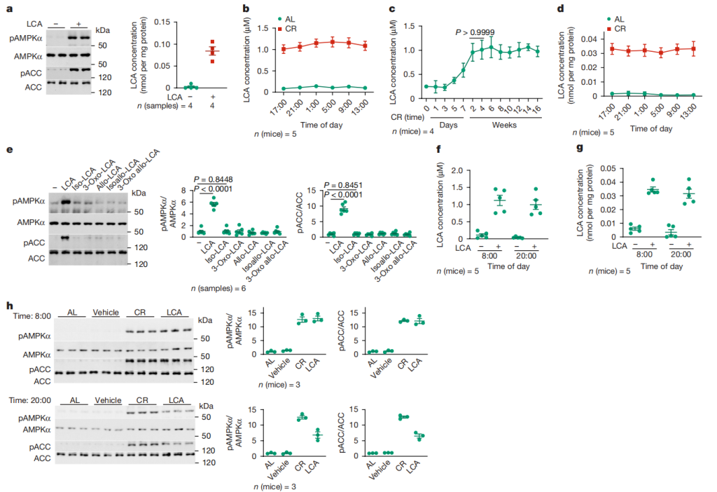 2.1圖2a:用 1μM LCA處理MEFs 4 小時(shí),測(cè)定 AMPK 活性和細(xì)胞內(nèi) LCA 濃度,結(jié)果表明 LCA 是 CR 血清中激活 AMPK 的因子,且處理后細(xì)胞內(nèi) LCA 濃度與 CR 小鼠組織中的濃度相似。
