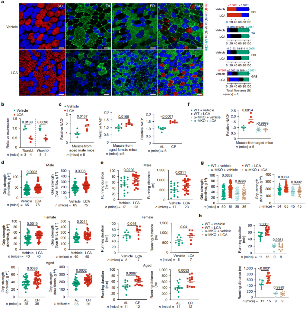 3.2 圖3c:測(cè)定老年小鼠肌肉中的 NAD?水平,發(fā)現(xiàn) LCA 處理可使其增加至與 CR 誘導(dǎo)相似的水平。