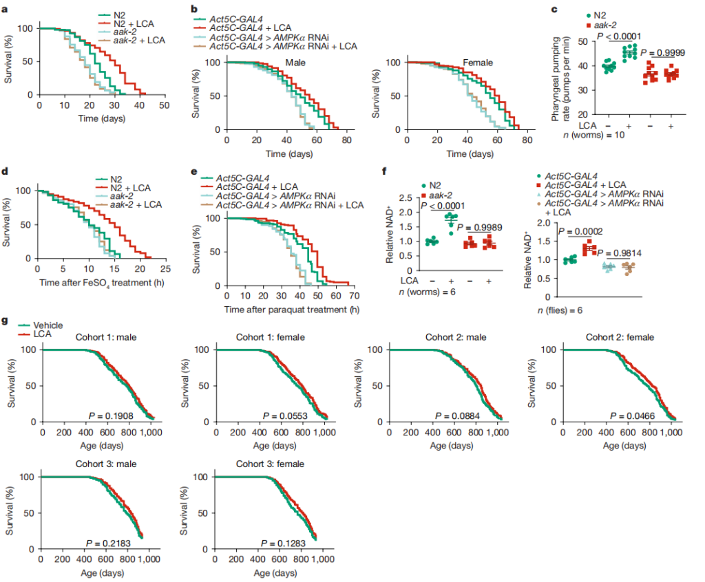 4.4 圖4f:測(cè)定線蟲和果蠅的 NAD?水平,發(fā)現(xiàn) LCA 可使其增加,且該作用依賴于 AMPK。
