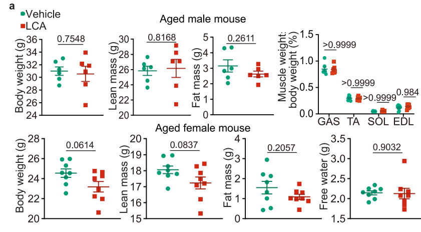 5.1 圖5a LCA 可預(yù)防老年小鼠肌肉萎縮:對(duì)老年雄性和雌性小鼠進(jìn)行實(shí)驗(yàn),給它們喂食 (2 -羥丙基)-β -環(huán)糊精包被的 LCA(1g/L于飲用水中)1 個(gè)月后,LCA 處理組小鼠的肌肉質(zhì)量與對(duì)照組相比,有明顯的維持或增加趨勢(shì)。這表明 LCA 能夠有效防止老年小鼠因年齡增長(zhǎng)而出現(xiàn)的肌肉萎縮情況,對(duì)肌肉健康具有積極的保護(hù)作用。除了肌肉質(zhì)量,該分析儀的數(shù)據(jù)還顯示,LCA 處理可能影響小鼠的脂肪體重和整體體重。雖然論文未對(duì)脂肪體重和體重變化進(jìn)行詳細(xì)討論,但從身體成分測(cè)量的綜合數(shù)據(jù)可以推測(cè),LCA 可能通過(guò)某種代謝調(diào)節(jié)機(jī)制,對(duì)小鼠體內(nèi)的脂肪積累或消耗產(chǎn)生影響,進(jìn)而調(diào)節(jié)身體的脂肪與瘦體重比例,維持身體成分的平衡。
