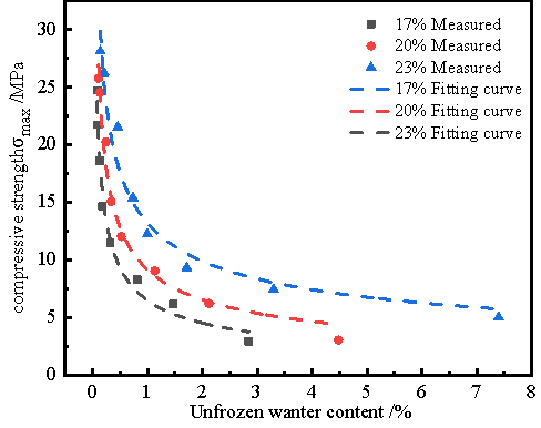 (4) 在0至-80°C范圍內,凍土的抗壓強度與溫度呈線性分布,與未凍水含量呈冪函數分布。