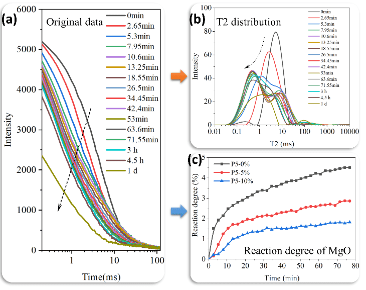 LF-NMR的信號強(qiáng)度/振幅與可蒸發(fā)的含水量呈正相關(guān)關(guān)系。通過表征樣品中可蒸發(fā)含水量的變化,可以根據(jù)反應(yīng)方程(1)計(jì)算出氧化鎂的反應(yīng)程度(圖1c)。