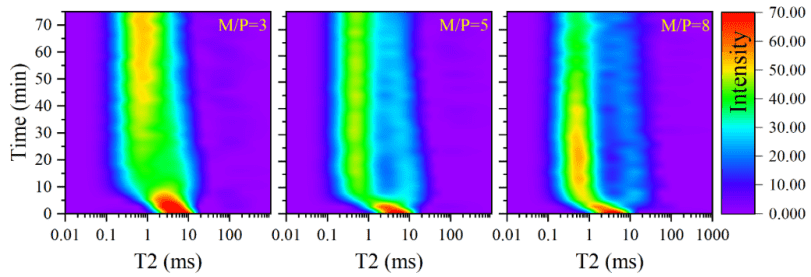 圖2 在反應(yīng)初始階段M/P摩爾比對T2分布的影響