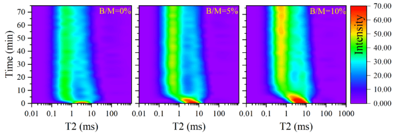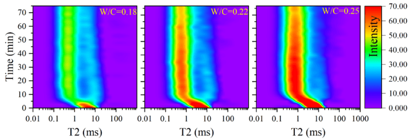 LF-NMR的主要原理是表征氫質(zhì)子在自由水中的弛豫行為。不同直徑孔隙中的水分子表現(xiàn)出不同的縱向/橫向弛豫時間和弛豫信號強(qiáng)度。通過監(jiān)測游離水向化學(xué)鍵合水的轉(zhuǎn)化過程,也可以對膠凝材料的水化動力學(xué)進(jìn)行研究。