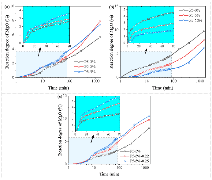 圖5 MgO反應(yīng)度的原位表征結(jié)果:(a)在不同M/P摩爾比的情況下;(b)在不同B/M比的情況下;(c)在不同W/C比的情況下