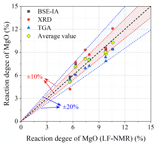 X軸為由LF-NMR確定的反應(yīng)度,Y軸為由其他方法確定的反應(yīng)度。用XRD-Rietveld法測定的氧化鎂的反應(yīng)度略高于LF-NMR法,而TGA方法的值則低于LF-NMR方法。
