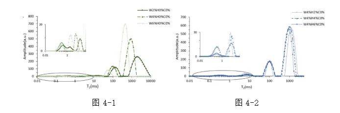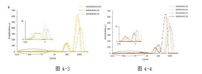 根據2%、4%和6%單組份乳化劑懸浮液T2衰減曲線,得到T2W和Tcur。隨著濃度從2%增加到6%, T2w 和 Tcur 減小,意味著更快的衰減過程和對氫質子的結合力更大。說明通過增加乳化劑濃度影響其分子內或分子間相互作用,從而增加其與氫質子的結合能力。