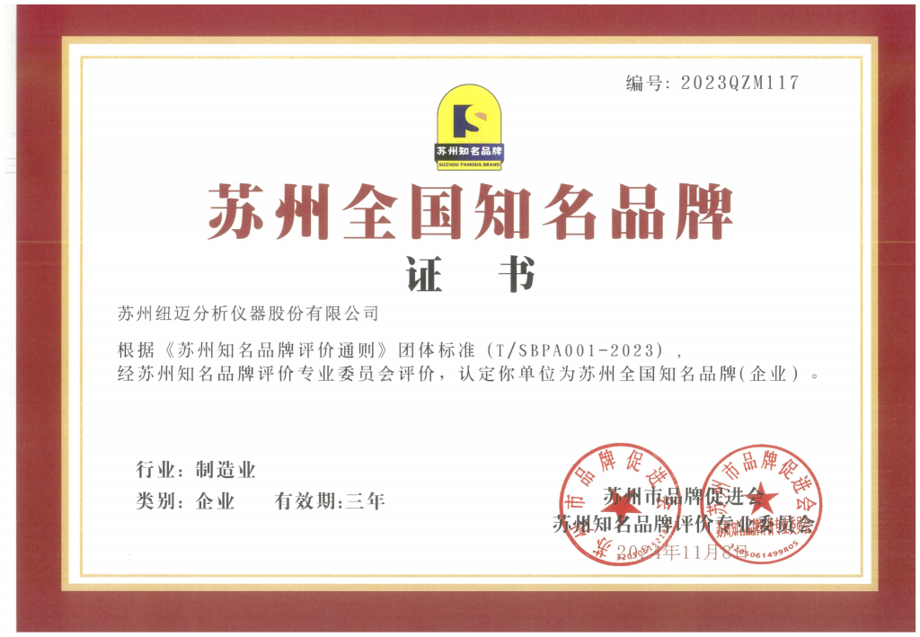 “蘇州全國知名品牌”的認定,這不僅是對紐邁分析在分析儀器領域卓越表現和品質追求的肯定,更是對我們品牌影響力和市場競爭力的認可。這一榮譽的獲得,標志著紐邁分析在行業內的地位和影響力的顯著提升,也是對我們團隊不懈努力和持續創新的高度認可。