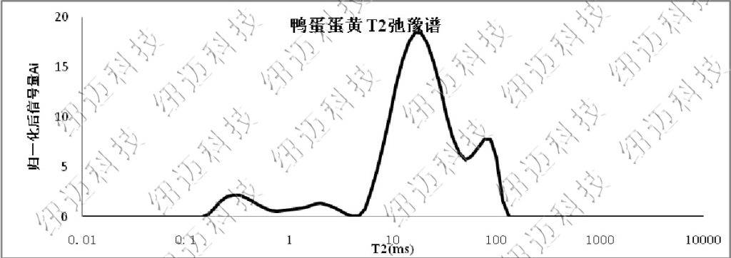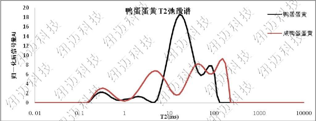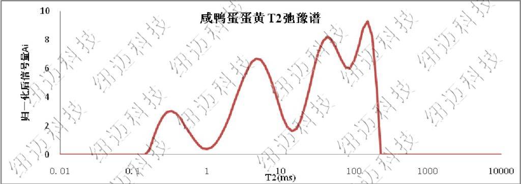 通過對核磁T2波譜分析,可以清晰的看到咸鴨蛋黃與普通鴨蛋黃的在油脂狀態上的不同。